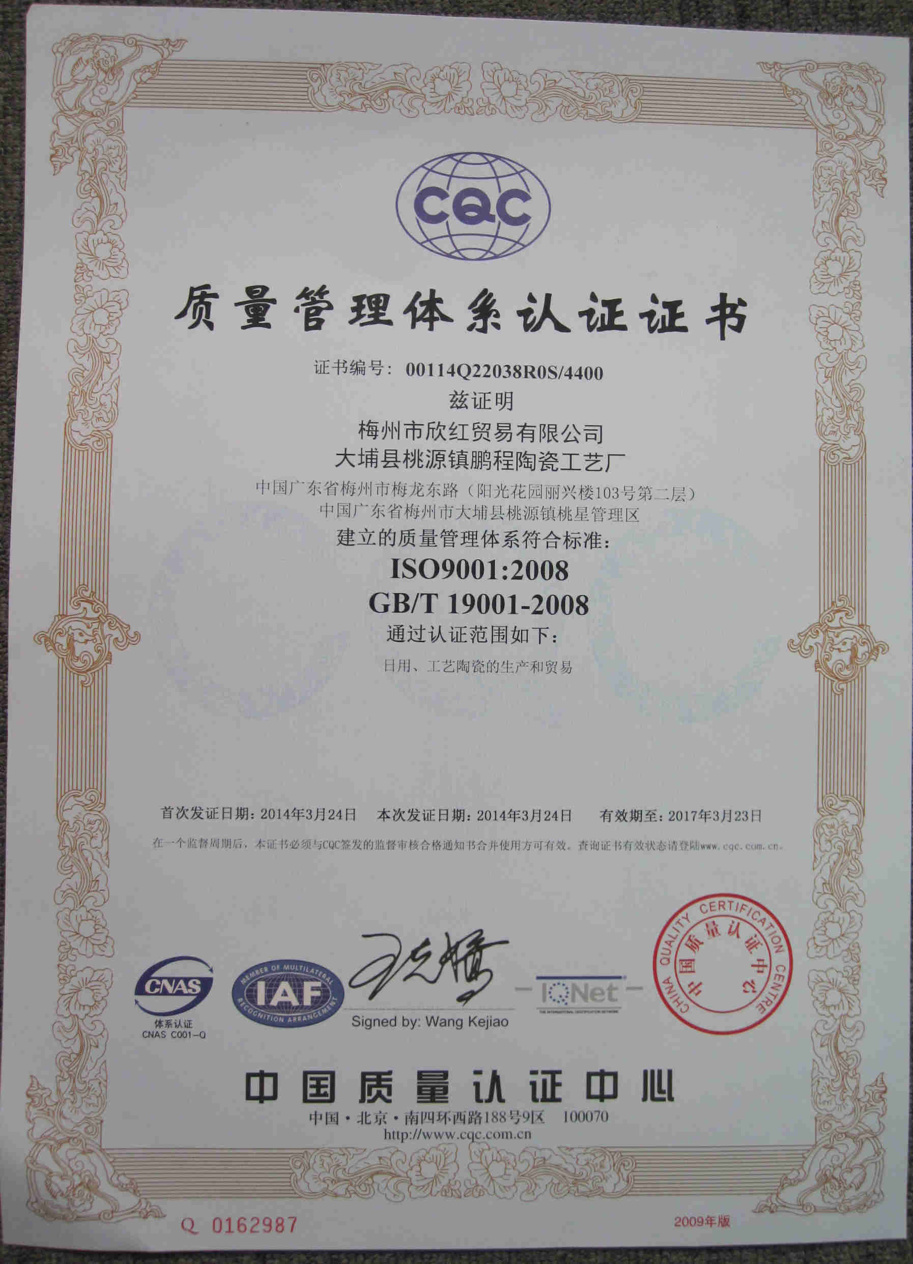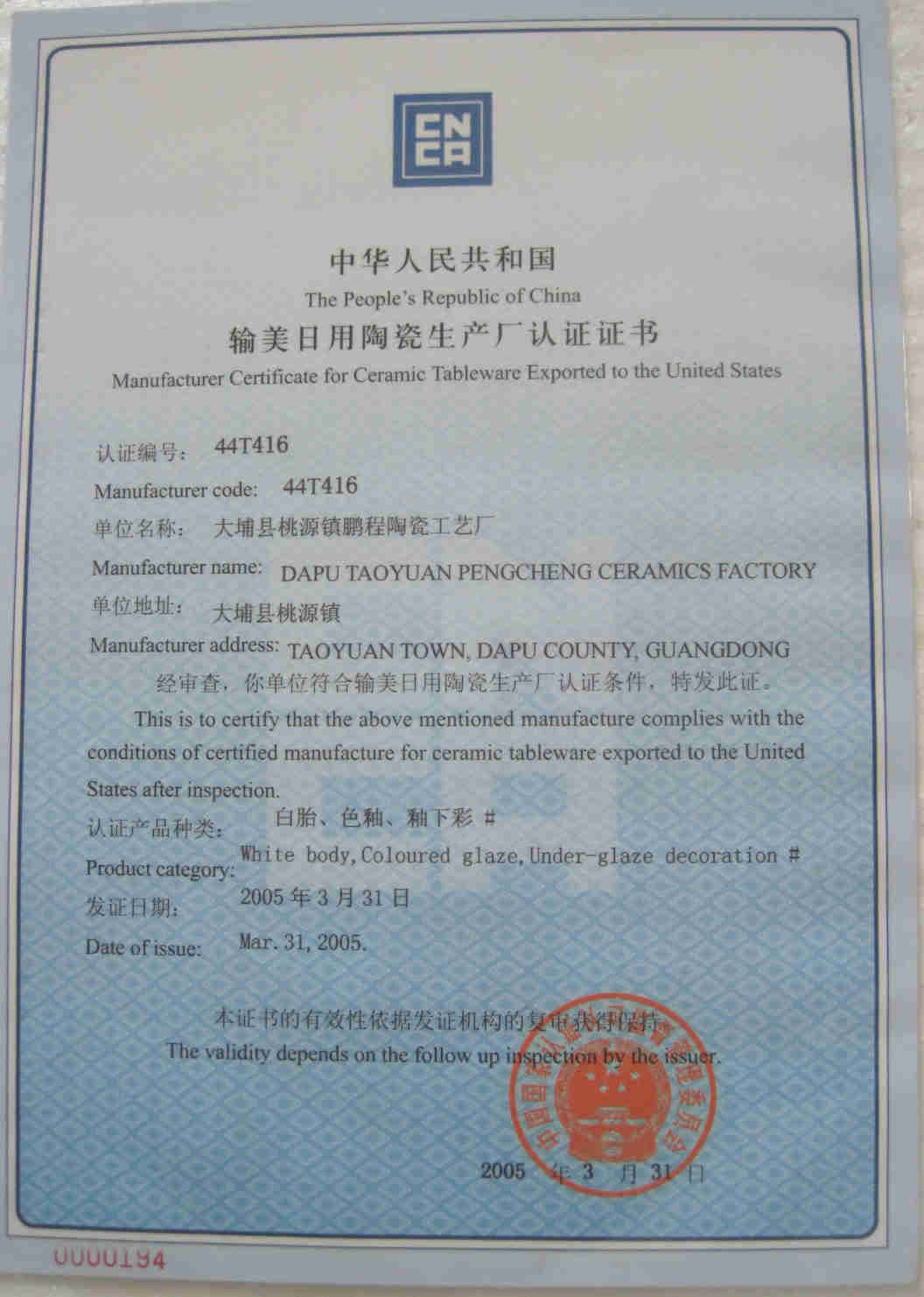 質(zhì)量是立廠之根本,客戶滿意是我們的目標(biāo)。企業(yè)以“保證產(chǎn)品質(zhì)量,保證客戶滿意”為宗旨,按照“以效益為中心,以質(zhì)量為主題”的思路,建立健全了完善的質(zhì)量保證體系,先后通過了ISO9001:2000質(zhì)量管理體系認(rèn)證和輸美日用陶瓷生產(chǎn)廠認(rèn)證。近年來,先后被評為梅州市“先進(jìn)民營企業(yè)”、大埔縣“納稅大戶”等榮譽(yù)稱號,企業(yè)影響力不斷擴(kuò)大,市場份額逐年增加,經(jīng)濟(jì)效益顯現(xiàn),利稅逐年攀升。